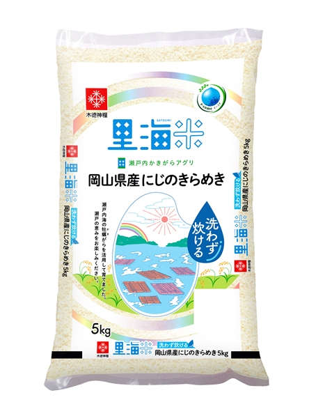 にじのきらめきは、お米の粒ひとつひとつが大きく、食べ応えがあります。その名の通り、ツヤのある美しい炊き上がりも特徴です。もっちりとした食感で粘りが強く、お米の甘みも強いので、濃い味のおかずにも負けません。また、おにぎりにしてお米そのものの味わいを楽しむのもおすすめです。 里海米とは、「牡蠣がらを肥料に使って育てられたお米」のことです。 海で育った牡蠣の殻を肥料に使いお米を育て、その田畑の栄養分が川、海へ流れまた牡蠣を育てる…という循環型農業を目指した「かきがらアグリ事業」から生まれました。